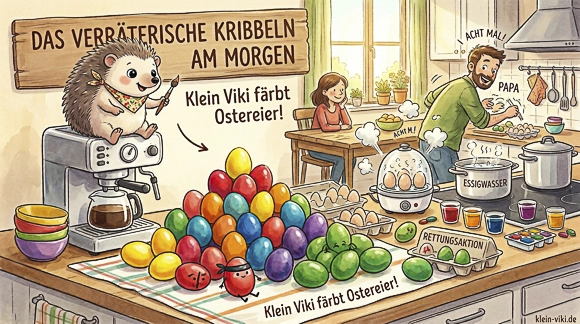 Seine Mission war es, Eier von rechts nach links im Kühlschrank zu räumen, sie umzustapeln, neu zu sortieren und dabei leise vor sich hin zu murmeln. Mama saß währenddessen am Küchentisch, beobachtete das Spektakel und wurde von seiner hektischen Eier-Logistik fast in den Wahnsinn getrieben. Ich saß mucksmäuschenstill auf meinem Lieblingsplatz und beobachtete das Treiben mit großen, neugierigen Knopfaugen. Dann fiel endlich das magische Wort, das dieses ganze Chaos erklärte: Wir färben Ostereier!